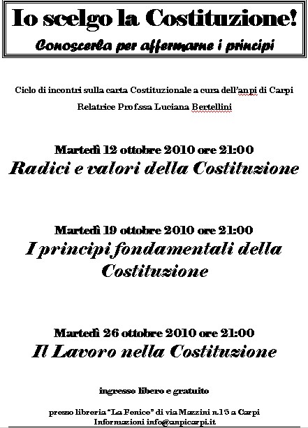 Un bel ciclo di iniziative messe in calendario dall’Anpi locale. In una fase come questa ritengo indispensabile conoscerla meglio, per vedere concretamente come sia attuale anche oggi nei suoi principi fondamentali. Ecco il Volantino dell’iniziativa