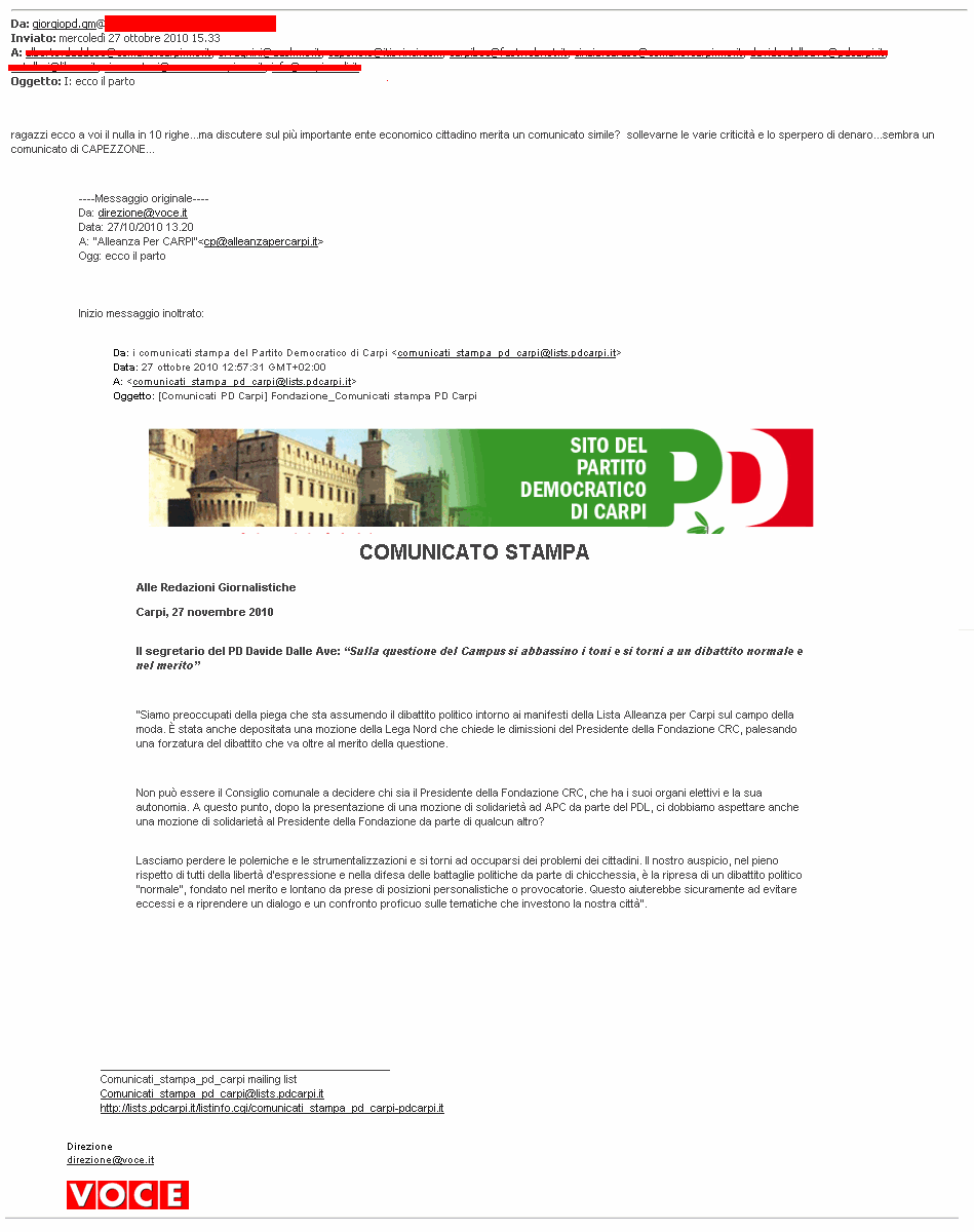 La cosa che mi ha stupito di più è la velocità di questo scambio di mail tra il settimanale, che riceve dal Pd il comunicato alle ore 12.57 del 27 ottobre, che inoltra ad Alleanza per Carpi 16 minuti dopo cioè alle ore 13.20.
