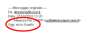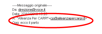 Infatti, leggendo sotto tra i vari “inoltro” (le e-mail precedenti) mi accordo che il messaggio originale è stato inviato dalla Direzione di Voce, come di vede in questa immagine