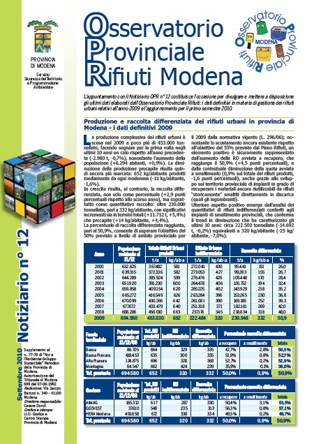 L’appuntamento con il Notiziario OPR n.12 rappresenta l’occasione per divulgare gli ultimi dati elaborati dall’Osservatorio Provinciale Rifiuti: idati definitivi in materia di gestione dei rifiuti urbani relativi all’anno 2009e l’aggiornamento per il primo semestre 2010.
