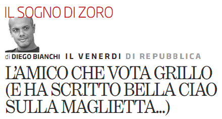 Indossa una maglietta con su scritto Bella Ciao a caratteri Coca Cola. Bella Ciao come il Che, come brand, come marchio pop, gassata e decontestualizzata, comunque Bella Ciao, sempre meglio di niente. A saperlo grillino non m’entusiasmo come forse pensava, ma neanche m’incazzo come ora sembra temere, anzi. La notizia di qualcuno che si dà alla politica in qualche modo, magari iscrivendosi per la prima volta ad un partito, anche ad un partito che dice che sono tutti uguali senza rendersi conto, così dicendo, di autocomprendersi nell’analisi, per me è sempre buona. Quasi a discolparsi di tanto slancio il mio amico prova ad elencare i punti del programma letto in rete, ma la cosa che ricorda meglio sono i militanti con le telecamere nei consigli comunali, e tanto basta per far partire un dibattito a più voci…