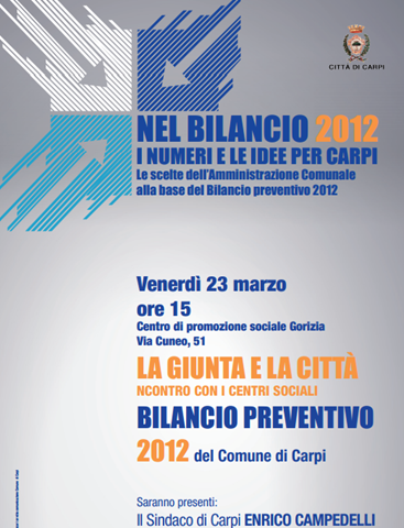 Prenderanno il via martedì 13 marzo a Cortile gli incontri organizzati dall’amministrazione comunale di Carpi per illustrare ai cittadini le linee strategiche del Bilancio di previsione 2012 e il Piano degli Investimenti 2012-14 dell’ente locale. Gli appuntamenti, dodici in tutto, e a cui parteciperanno il Sindaco Enrico Campedelli e i componenti della Giunta, si svolgeranno in diversi luoghi della città e nelle frazioni. Quest’anno si terrà anche una presentazione riservata specificamente al mondo del volontariato e una a quello dei Centri sociali. Previste anche due mattinate (giovedì 22 e giovedì 29) dedicate all’incontro tra Giunta comunale e cittadini in piazza Martiri: il secondo appuntamento, a cui sono saranno invitati i rappresentanti dei mezzi di comunicazione all’insegna del confronto e della trasparenza, consisterà in una ‘pubblica intervista’ a più voci, alla presenza dei cittadini interessati.