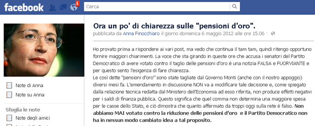 Pubblico una nota che ha scritto la nostra capogruppo in Senato Anna Finocchiaro sulla vicenda delle “Pensioni d’Oro” e il voto del Pd.
