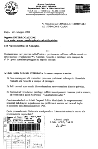 Cosa fa la Lega Nord? Con arguto ed insospettabile tempismo presenta una interrogazione (depositata oggi), nella quale chiede spiegazioni su dei container in sosta nel piazzale delle Piscine di Carpi…… adducendo che questo crea problemi soprattutto quando si tiene la festa a luglio del PD (sic)…. si vede proprio che gli amici del carroccio non si sono ripresi dalla botta elettorale che hanno preso, e come dei pugili suonati ora “menano” fendenti a vuoto a destra e a manca….. No so, forse sono molto sensibile a quello che è successo domenica mattina, ma questa interrogazione potevano risparmiarsela, o almeno aspettare un momento diverso……
