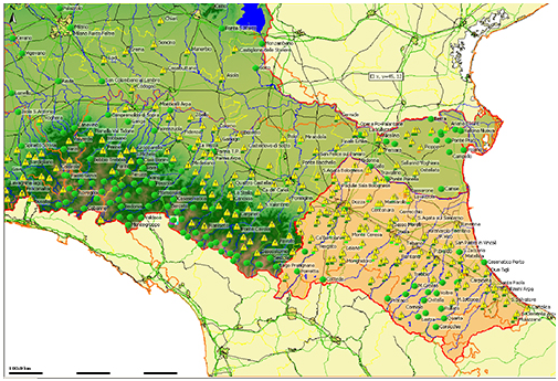 Figura 1 – Le stazioni pluviometriche della Regione Emilia-Romagna affette da assenza di precipitazione significativa sono evidenziate con un triangolo. In particolare, il superamento del periodo di ritorno del numero dei giorni consecutivi non piovosi pari a 2, 10 e 50 anni viene rappresentato rispettivamente con il colore verde scuro, verde chiaro e arancione.