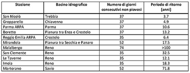 L’estate 2012 presenta un numero di giorni consecutivi non piovosi eccezionale: in tutta la regione Emilia-Romagna, l’assenza di precipitazione, nonostante alcuni temporali, raggiunge valori del periodo di ritorno anche centennali.