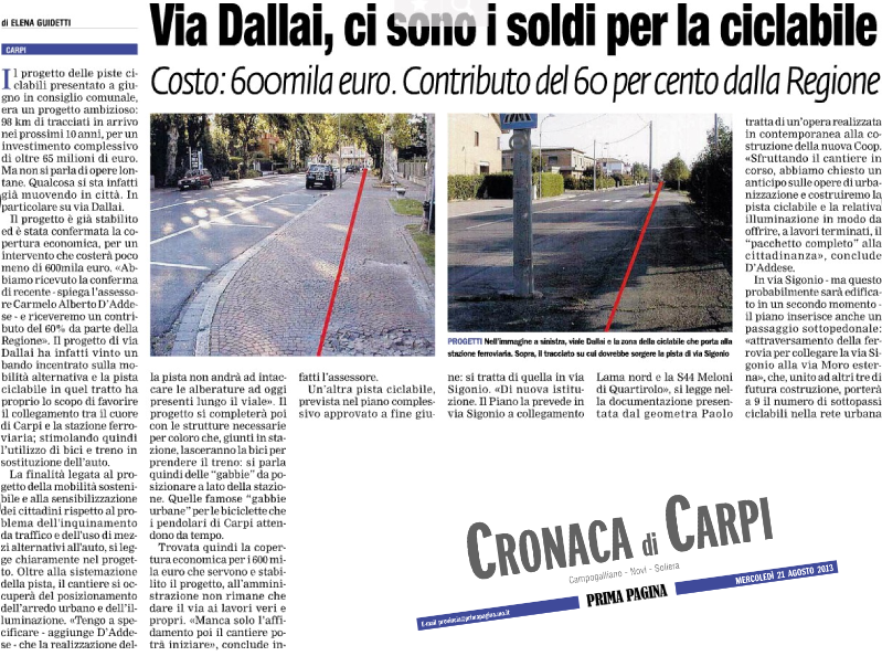 PRIMA PAGINA: “VIA DALLAI, CI SONO I SOLDI PER LA CICLABILE”