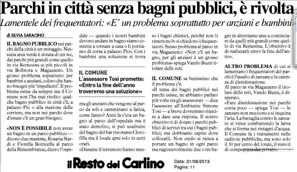 Pubblico un articolo del Resto del Carlino, che al di là del titolo (non è colpa dei giornalisti il titolo), fa il punto su due questioni, il primo è la presenza di servizi igenici nei Parchi cittadini, il secondo la presenza delle zanzare nei parchi.