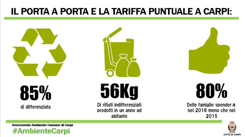 84% come percentuale di differenziata facendo in due anni un balzo di oltre 20 punti (eravamo al 34% nel 2006, al 63% nel 2013, al 74% nel 2015). Passiamo da 200kg/anno di rifiuti procapite di rifiuti indifferenziati a poco meno di 60kg/anno (in entrambi i dati sono compresi gli abbandoni), quindi portando un indubbio beneficio all’ambiente. Infine i dati di questi primi 4 mesi di “Tariffa Puntuale” in una proiezione sul restanti 8 mesi che l’80% delle famiglie carpigiane pagheranno meno il servizio rispetto l’anno precedente. Quindi tutti gli obiettivi che ci eravamo prefissati di raggiungere sono stati centrati, alcuni anche in modo anticipato rispetto a quello che si pensava. Tutto questo grazie ad una comunità che ha capito la portata della sfida che cimentandosi con questo nuovo sistema ha capito la sua utilità, grazie ad una azienda, AIMAG, che cercato di mettere in campo le migliori soluzioni tecniche per introdurre questo sistema sul nostro territorio.