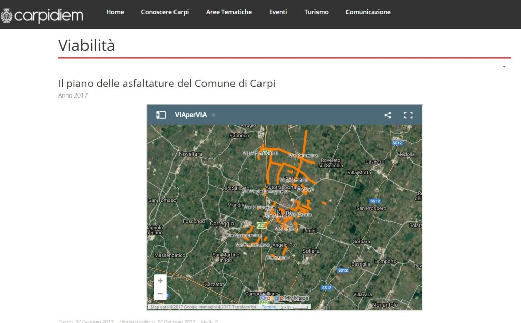 Da oggi è disponibile sulla Rete Civica Carpidiem la mappa delle strade che verranno interessate nel corso del 2017 da interventi di asfaltatura e manutenzione. Cliccando sulla sezione ViaperVia che si trova in home page si potranno vedere indicate le vie oggetto dei lavori grazie a googlemaps (la Giunta comunale ha stanziato la settimana scorsa 1.2 milioni di euro per questi interventi) e anche trovare l’elenco preciso di tutte le strade, con le indicazioni di tempi e modi. Ad esempio se si entra in ViaperVia e si clicca su via Buonarroti si scoprirà che l’asfaltatura riguarderà il tratto della strada che va da via Cimabue a via Leonardo da Vinci, zona parco, con fresature a ridosso delle cunette e formazione di tappeto d’usura. Sono indicati anche i tempi dell’intervento, in questo caso primavera-estate 2017.