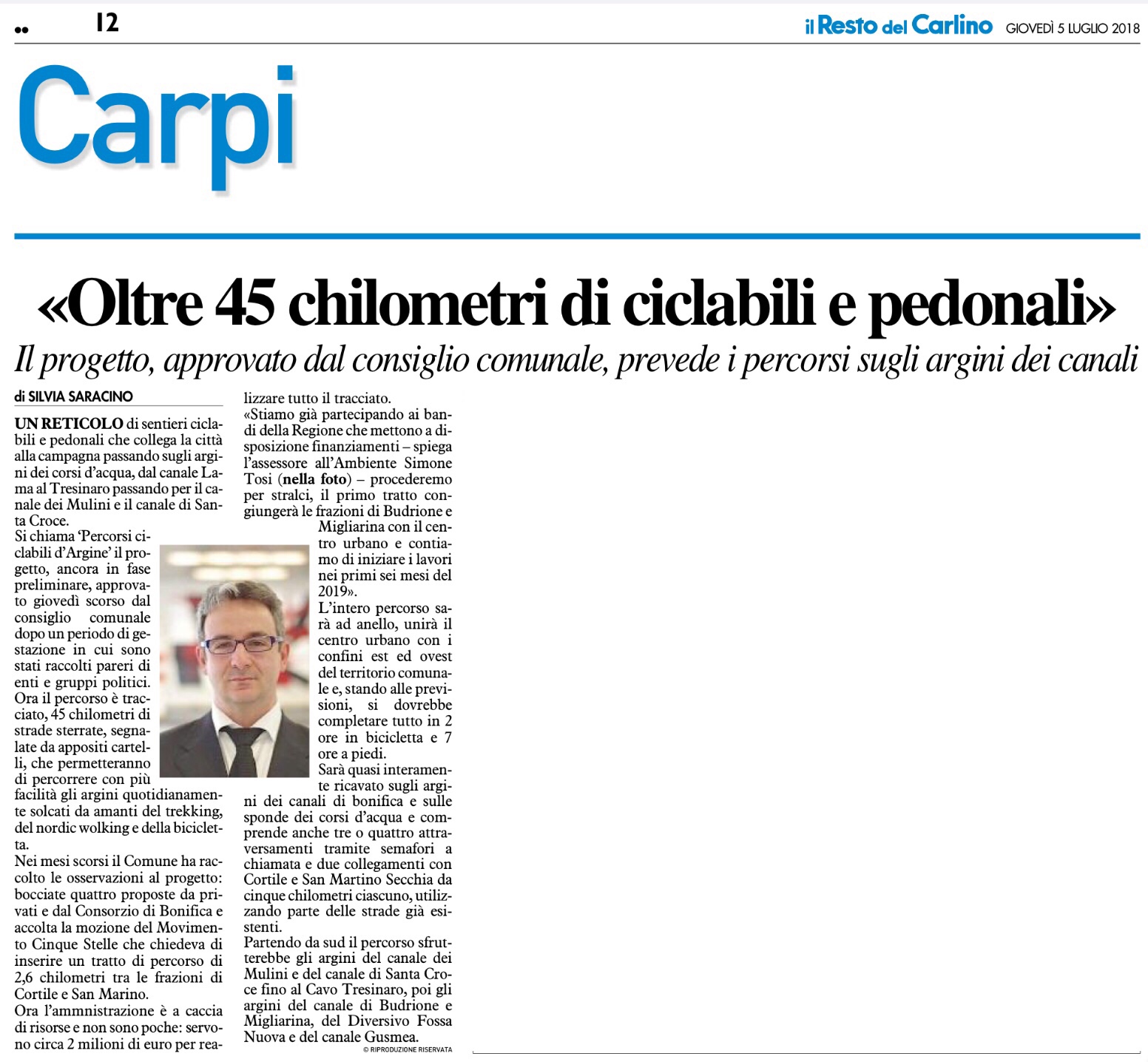 “di SILVIA SARACINO UN RETICOLO di sentieri ciclabili e pedonali che collega la città alla campagna passando sugli argini dei corsi d’acqua, dal canale Lama al Tresinaro passando per il canale dei Mulini e il canale di Santa Croce. Si chiama ‘Percorsi ciclabili d’Argine’ il progetto, ancora in fase preliminare, approvato giovedì scorso dal consiglio comunale dopo un periodo di gestazione in cui sono stati raccolti pareri di enti e gruppi politici. Ora il percorso è tracciato, 45 chilometri di strade sterrate, segnalate da appositi cartelli, che permetteranno di percorrere con più facilità gli argini quotidianamente solcati da amanti del trekking, del nordic wolking e della bicicletta. Nei mesi scorsi il Comune ha raccolto le osservazioni al progetto: bocciate quattro proposte da privati e dal Consorzio di Bonifica e accolta la mozione del Movimento Cinque Stelle che chiedeva di inserire un tratto di percorso di 2,6 chilometri tra le frazioni di Cortile e San Marino. Ora l’ammnistrazione è a caccia di risorse e non sono poche: servono circa 2 milioni di euro per realizzare tutto il tracciato. «Stiamo già partecipando ai bandi della Regione che mettono a disposizione finanziamenti – spiega l’assessore all’Ambiente Simone Tosi (nella foto) – procederemo per stralci, il primo tratto congiungerà le frazioni di Budrione e Migliarina con il centro urbano e contiamo di iniziare i lavori nei primi sei mesi del 2019». L’intero percorso sarà ad anello, unirà il centro urbano con i confini est ed ovest del territorio comunale e, stando alle previsioni, si dovrebbe completare tutto in 2 ore in bicicletta e 7 ore a piedi. Sarà quasi interamente ricavato sugli argini dei canali di bonifica e sulle sponde dei corsi d’acqua e comprende anche tre o quattro attraversamenti tramite semafori a chiamata e due collegamenti con Cortile e San Martino Secchia da cinque chilometri ciascuno, utilizzando parte delle strade già esistenti. Partendo da sud il percorso sfrutterebbe gli argini del canale dei Mulini e del canale di Santa Croce fino al Cavo Tresinaro, poi gli argini del canale di Budrione e Migliarina, del Diversivo Fossa Nuova e del canale Gusmea. “